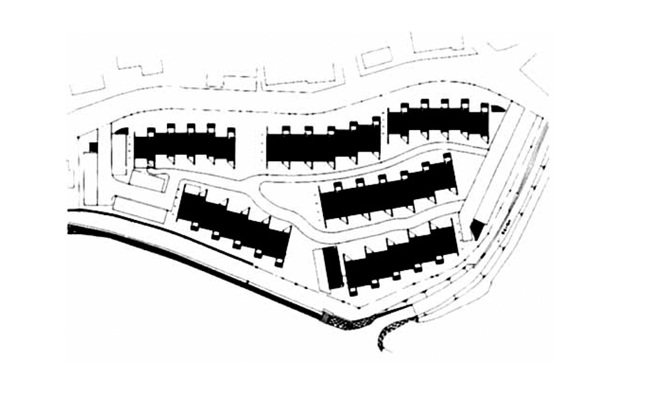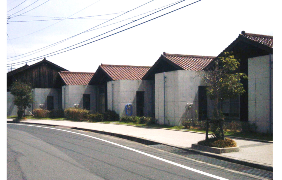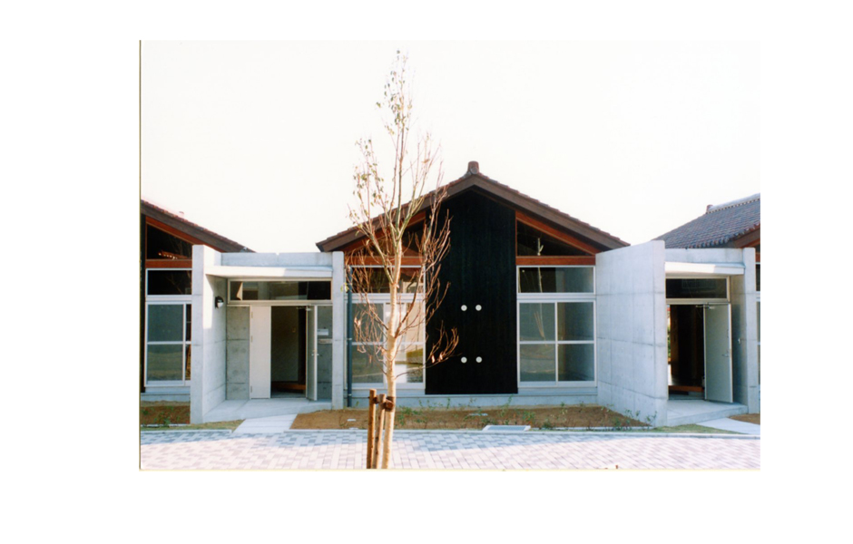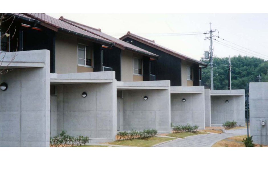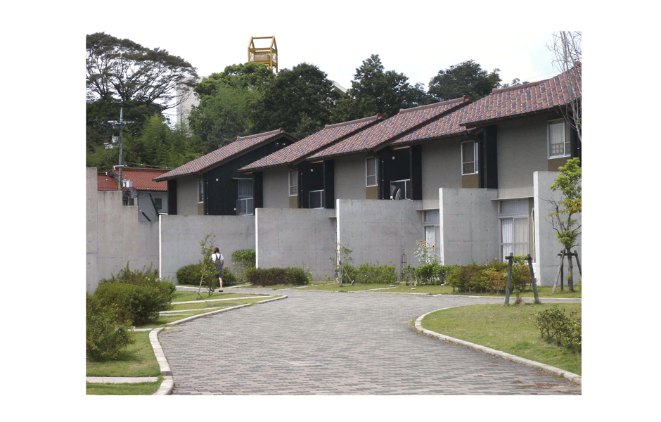 原为平方小区的改建项目,沿袭原住户拥有私家庭院,接地性高的居住形式。平方,夹层住宅的混在形成连排构成。钢筋混凝土的隔墙确保了邻里之间的遮音性,防火性。另外混凝土隔墙中间夹杂部分以及屋顶均采用木结构,使得室内空间充满原木气息。各户的山形屋顶均使用传统建筑材料,红石州瓦,体现地域景观的同时,也成为小区独特的风景。
