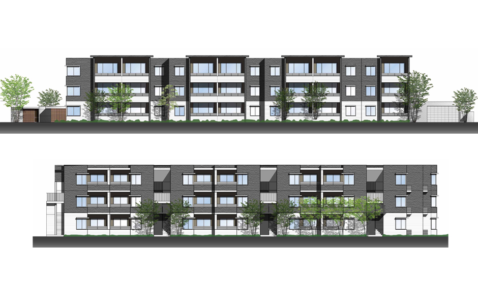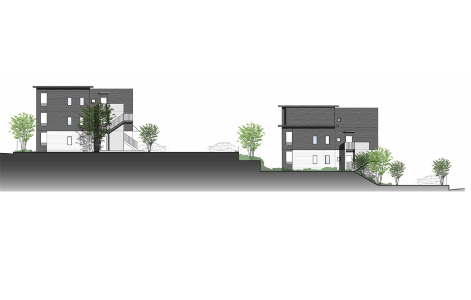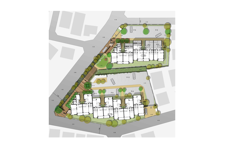 位于小区内某公司家属宿舍的设计方案,考虑以融合周边环境的一户建为主,在建筑体量上,设置为分节雁行,并采用斜面屋顶。对1层与2、3层的色调、材质方面都做出了调整,实现缩小规模,调和与周边环境的目的。